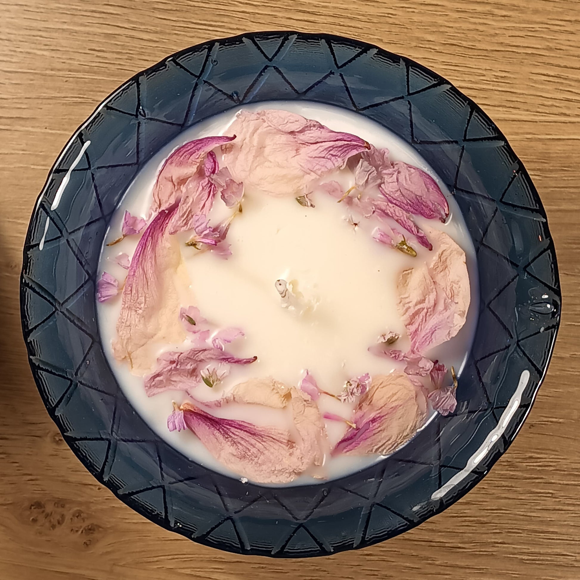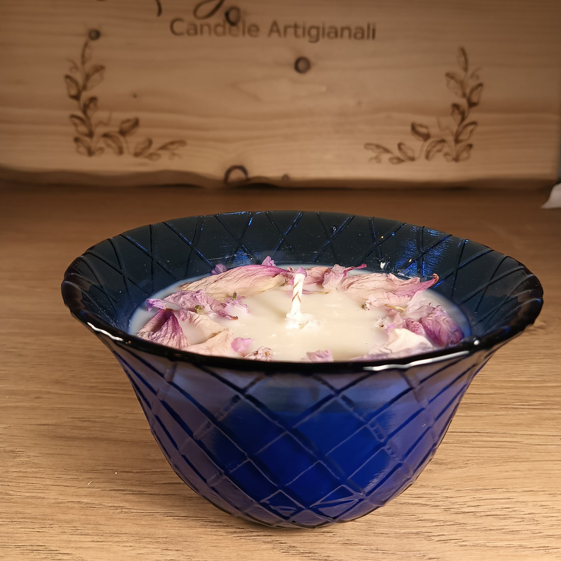 Candela di 260gr in cera di soia alla fragranza "Alba sul Mare" (Frangipani - Vaniglia - Muschio Bianco) decorata a mano con petali di peonia e statice rosa.