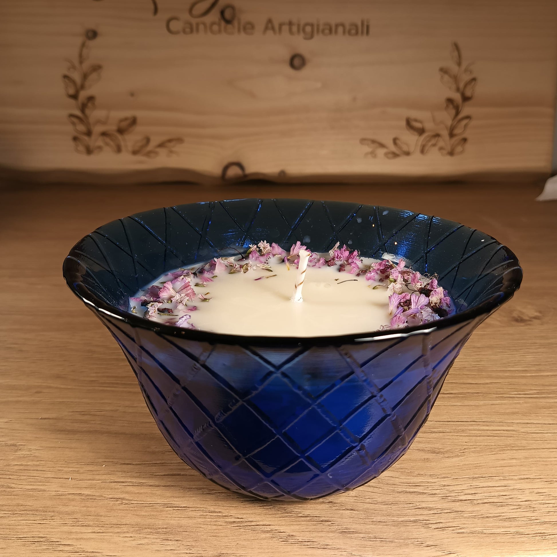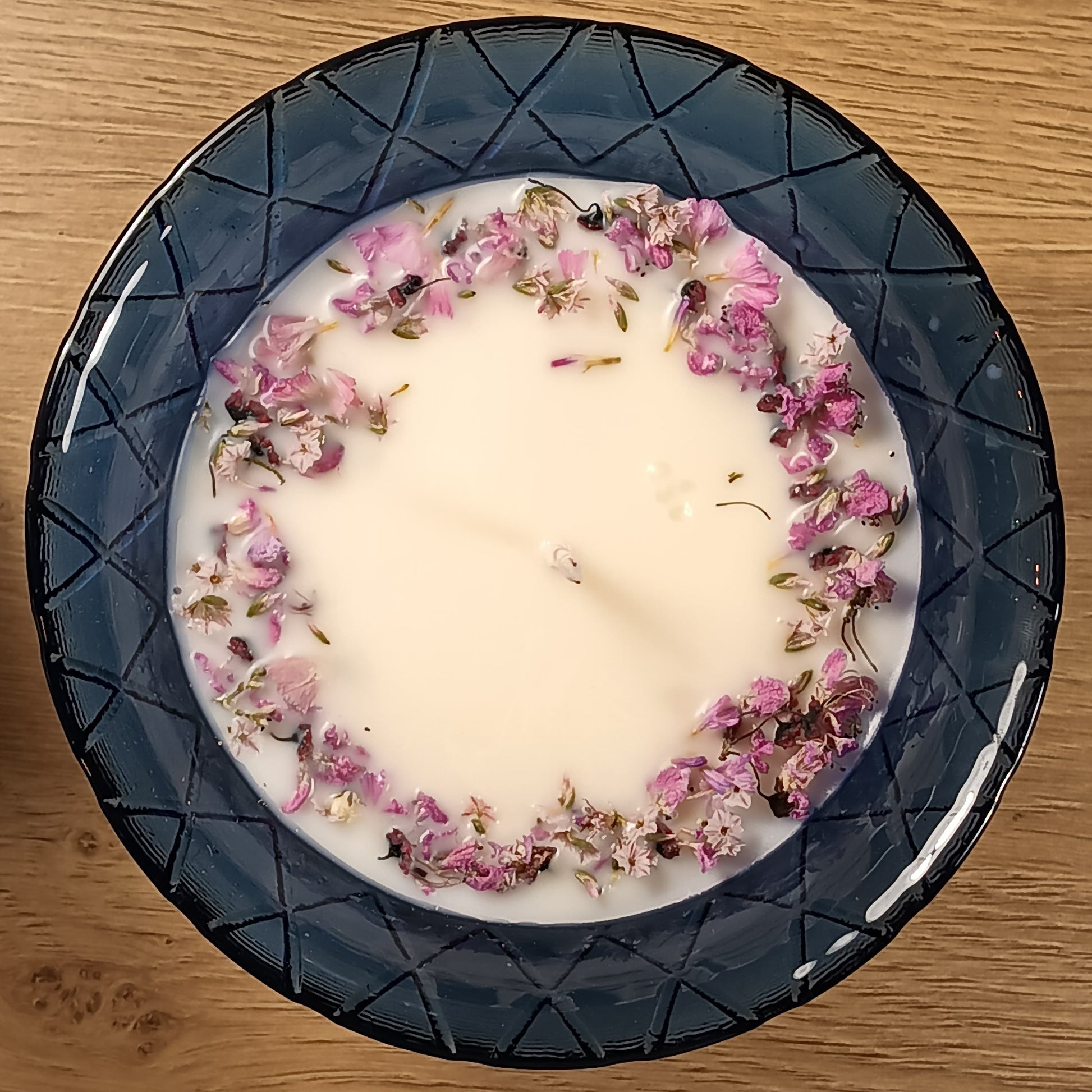 Candela di 260gr in cera di soia alla fragranza "Alba sul Mare" (Frangipani - Vaniglia - Muschio Bianco) decorata a mano con fiori dell'Albero di Giuda e statice rosa.
