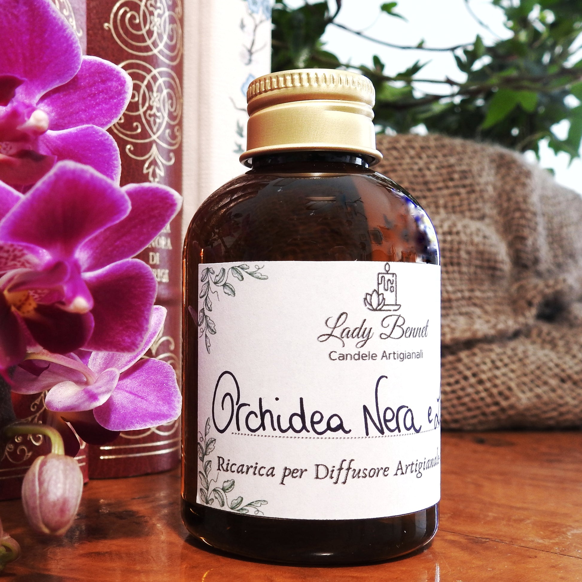 Una composizione floreale intensa e vellutata, che unisce la profondità dell’orchidea nera alla delicatezza del lillà. Ideale per profumare con eleganza e discrezione ogni ambiente.